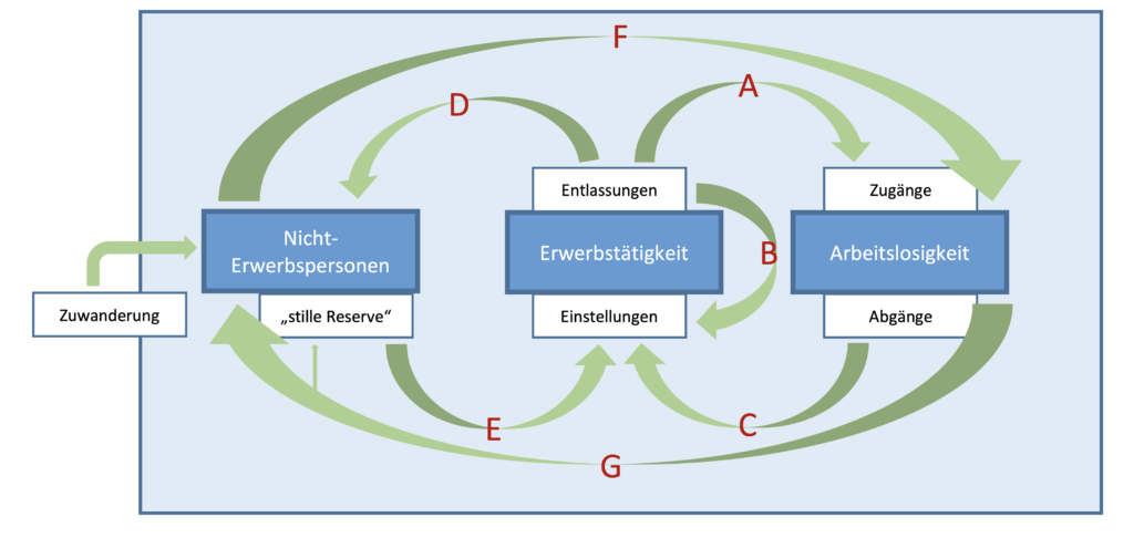Kann er nach erfolgreicher Arbeitsvermittlung wieder aus der Arbeitslosigkeit in die Erwerbstätigkeit gelangen, so ist er der Stromgröße (C) gefolgt. Man kann auch entlassen werden und dann nicht arbeitslos, sondern nur „nicht erwerbstätig“ sein.